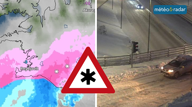 Notre carte radar météo, à gauche, montre les chutes de neige en Islande cette semaine et l'image de droite une photo actuelle prise par une webcam à Reykjavík.