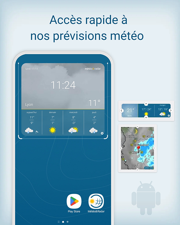 Vous souhaitez avoir un accès rapide à nos prévisions météo depuis votre écran d'accueil ? Alors ajoutez le widget Météo & Radar !