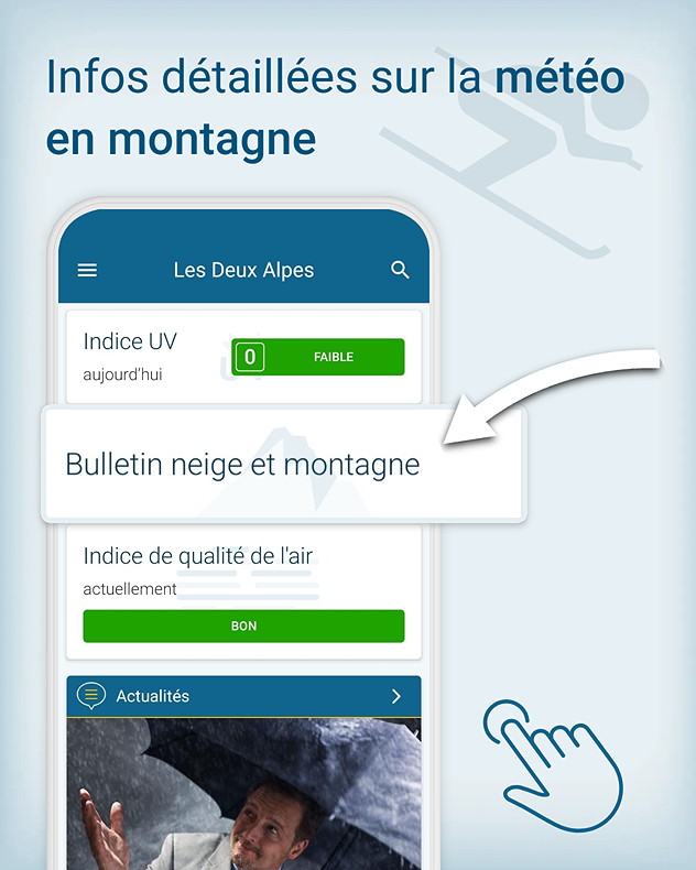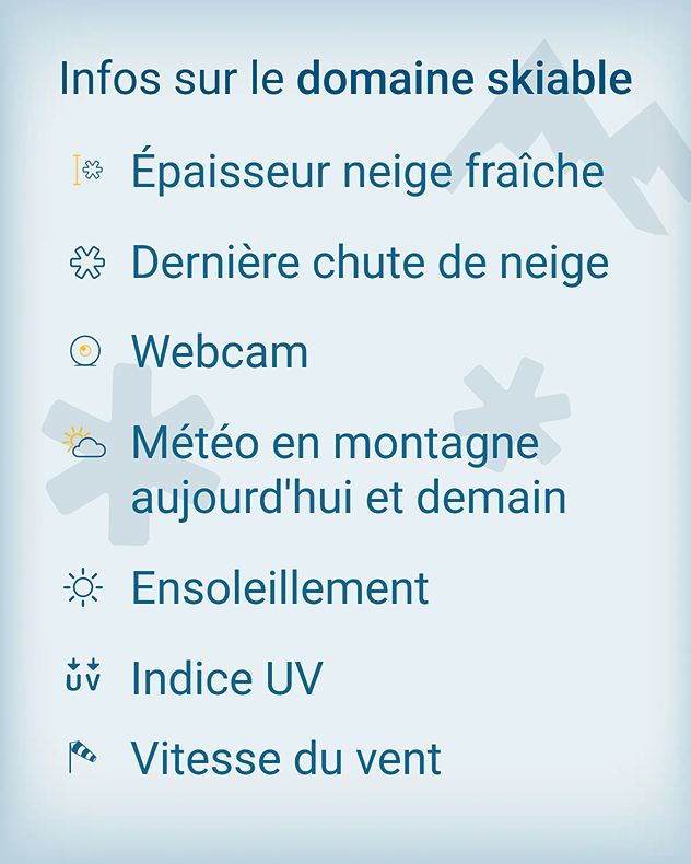 Pour tous les passionnés de neige, l’application Météo & Radar et son radar météo sont aussi essentiels en hiver que les skis, le casque et les bâtons. Avec le bulletin neige et montagne, nous vous proposons un service unique et complet.Depuis chez vous, vous pouvez savoir en un instant s’il vaut la peine d’emporter votre équipement de ski. Retrouvez toutes les informations importantes sur le domaine skiable le plus proche, ainsi que sur l’enneigement en vallée et en altitude, présentées de manière claire et pratique.Chaque jour, des données actualisées sur l’état des pistes vous sont fournies. En complément, des images de webcams vous permettent de découvrir en temps réel l’aspect de votre destination.Vous êtes amateur de ski nordique ? Vous êtes également bien préparé : en un coup d’œil, consultez le nombre de kilomètres de pistes damées.Planifiez facilement votre journée à la neige grâce aux prévisions dédiées à la montagne et au ski :