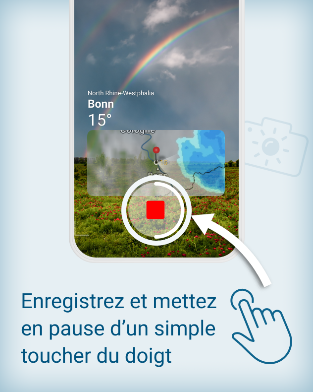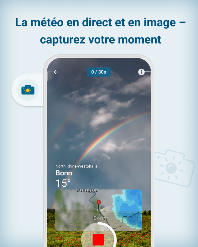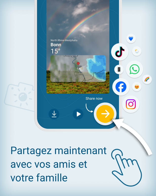 Un bonheur partagé est un bonheur décuplé. Cela vaut aussi pour le plaisir de partager des moments particuliers. C’est pourquoi l’application Météo & Radar propose une fonctionnalité dédiée : observer, s’émerveiller, capturer — et partager l’instant.
